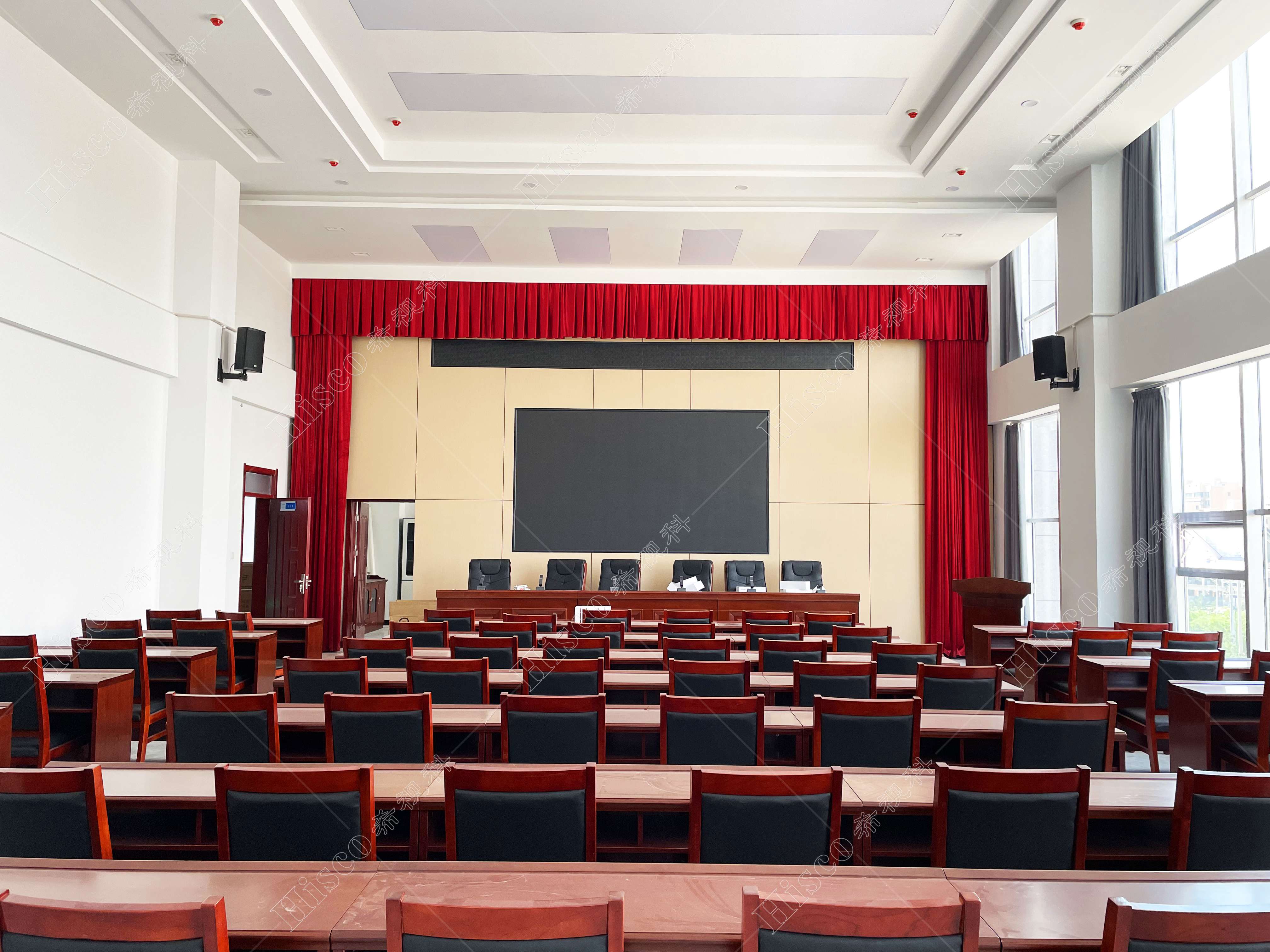 3.全场各个位置无明显回音、颤动回声和声聚焦等音质缺陷。(但考虑到会场如在装修时没有进行必要的吸声处理,所以必须要求在会议时进行必要的人工干预手段来弥补,如会议时尽量拉起窗帘,窗帘选用的布料厚度要求等)