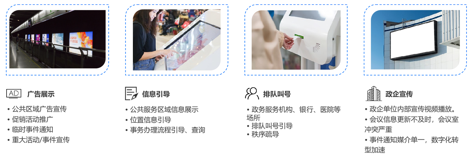 • 在办事大厅安装若干台显示终端,可根据播放时间设置节目单,播放社会热点推送、国家政策传达、优秀干部竞选、会议培训信息、机密信息审核、岗位招聘、公共服务介绍