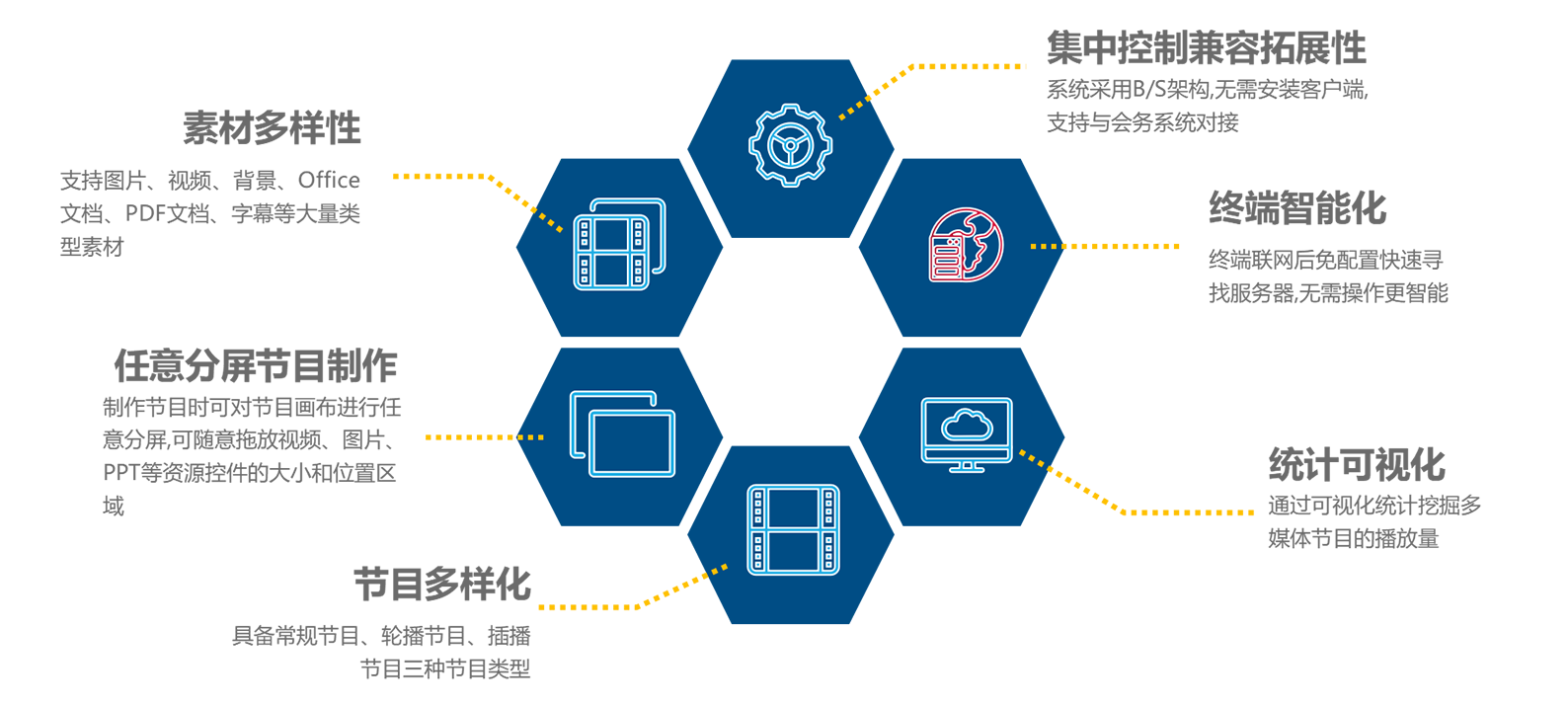 • 采用“B/S”架构,拥有完美的跨平台解决方案,支持私有云/公有云部署,分布式区域管理技术,有效整合各种多媒体资源。