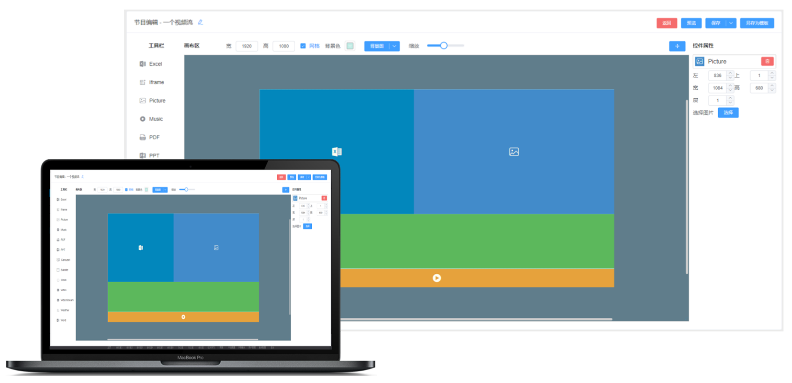 模版编辑功能是多媒体发布系统的核心重要功能,本系统所提供的模版编辑功能强大,使用灵活方便,用户自定义编辑,像使用PPT创建幻灯片一样方便和简单。