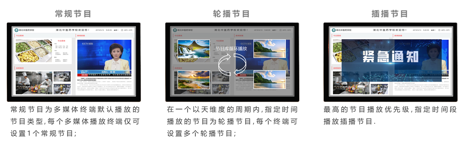 • 支持多种节目播出方式:普通发布、循环播放、定时播出、即时插播等。