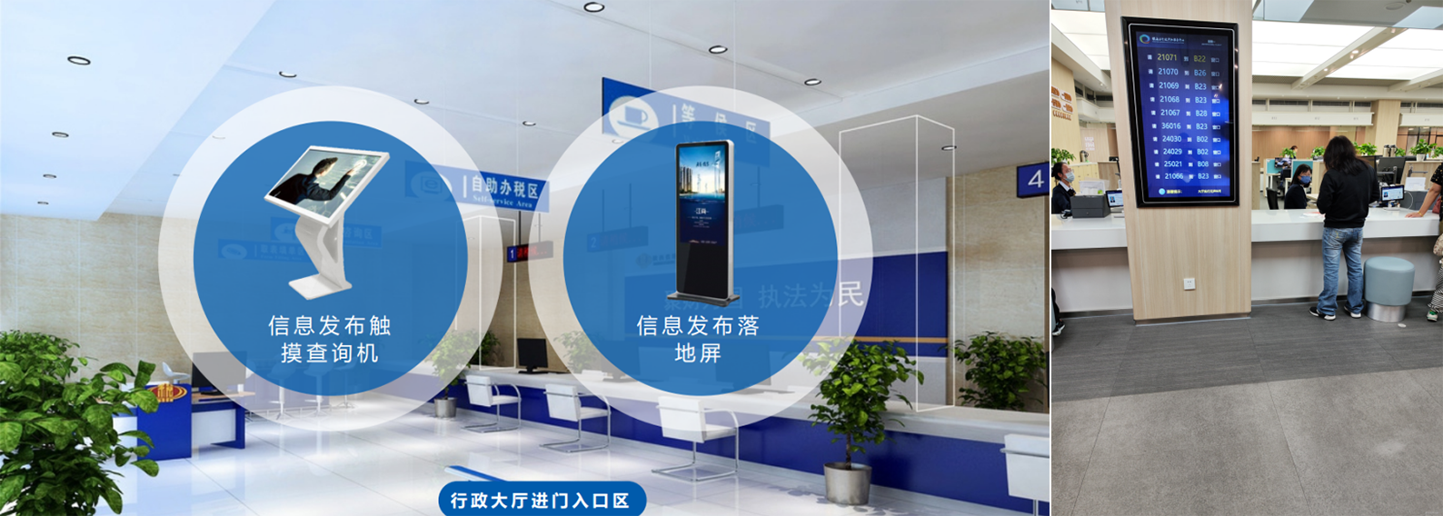 • 发布显示行政中心风采、宣传册等,与排队叫号系统对接,实时同步显示当前窗口区叫号信息、办理事项及进度