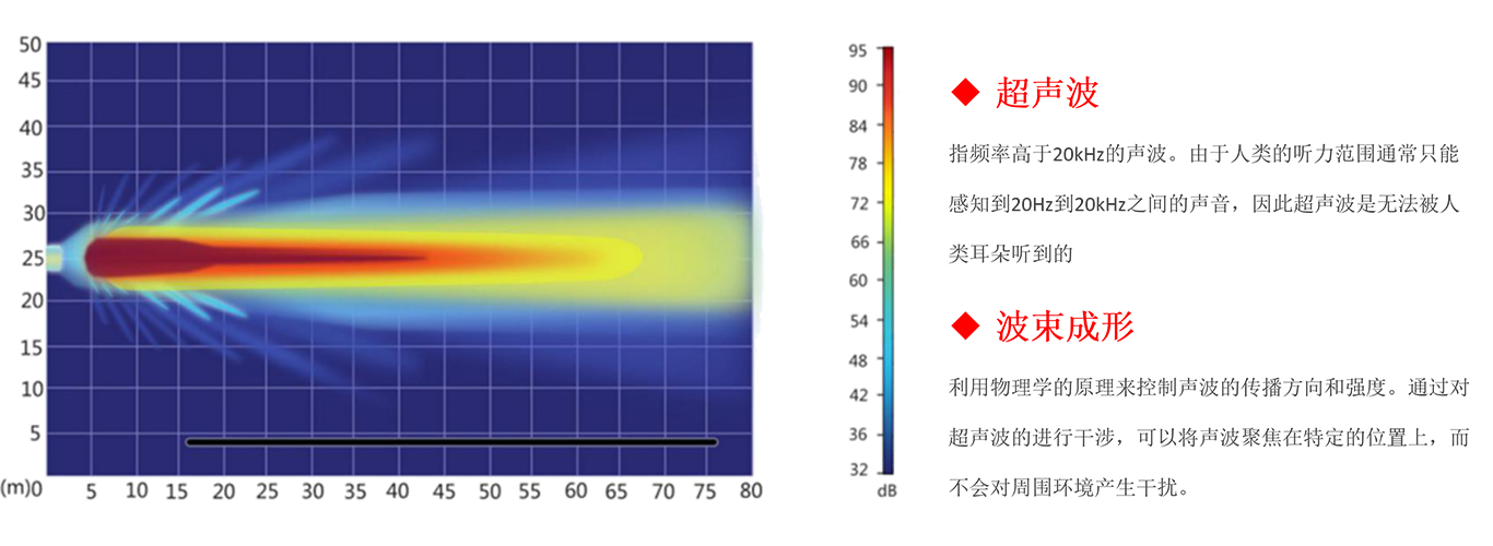 向特定区域提供了一种有效的声音传播方式,无需使用大型扬声器阵列,也可以将声音高度定向的投射到特定区域,创造了一个精确的、静谧的、不干扰周边环境的、独立的音频空间。