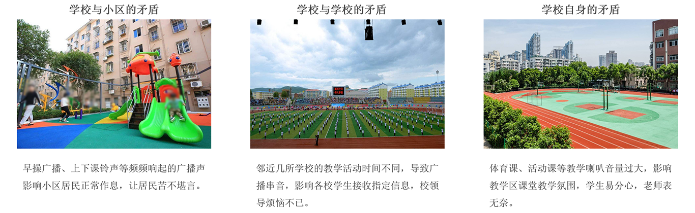 学校是培养学生自主学习、引导学生健康成长的重要场所,优质的声环境在学校整体教学环境中显得尤为重要。然而,由于近年来校园选址多在小区旁边或多个学校形成“教学城”,在此特殊背景下,传统的校园广播暴露了以下几个问题: